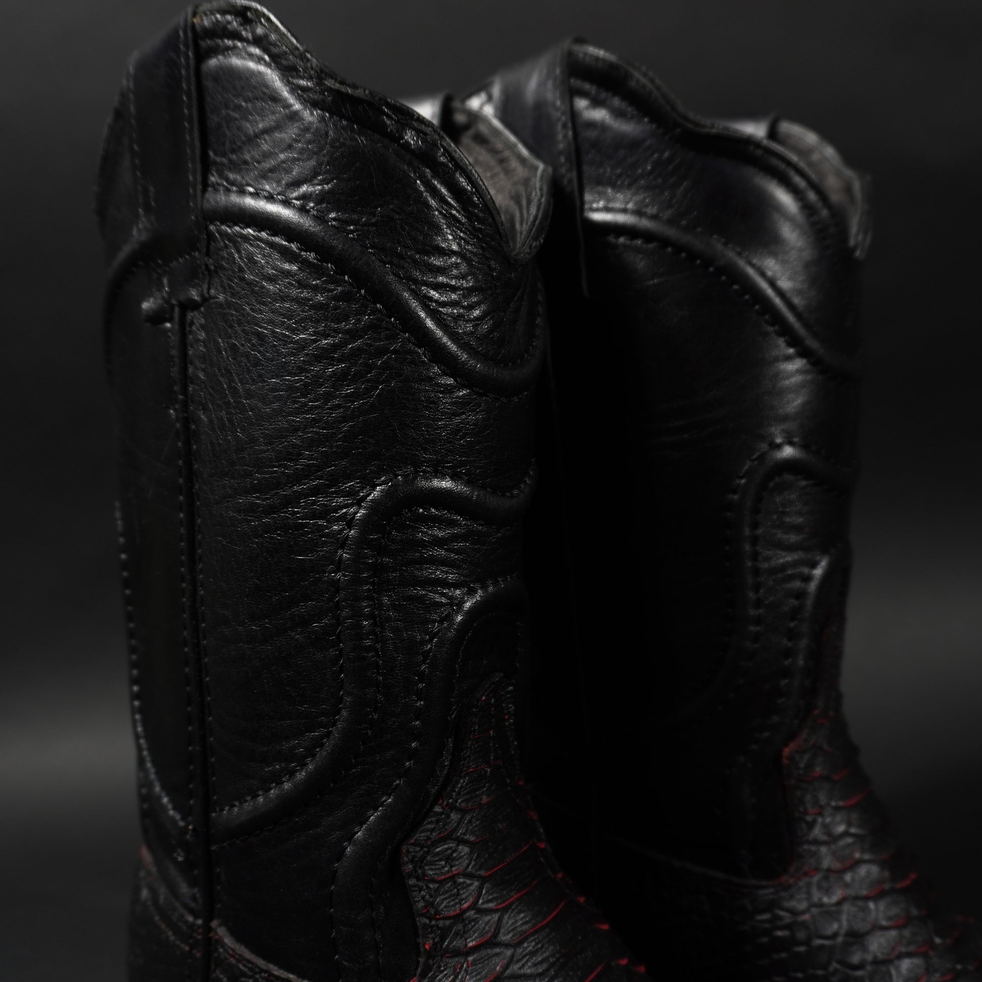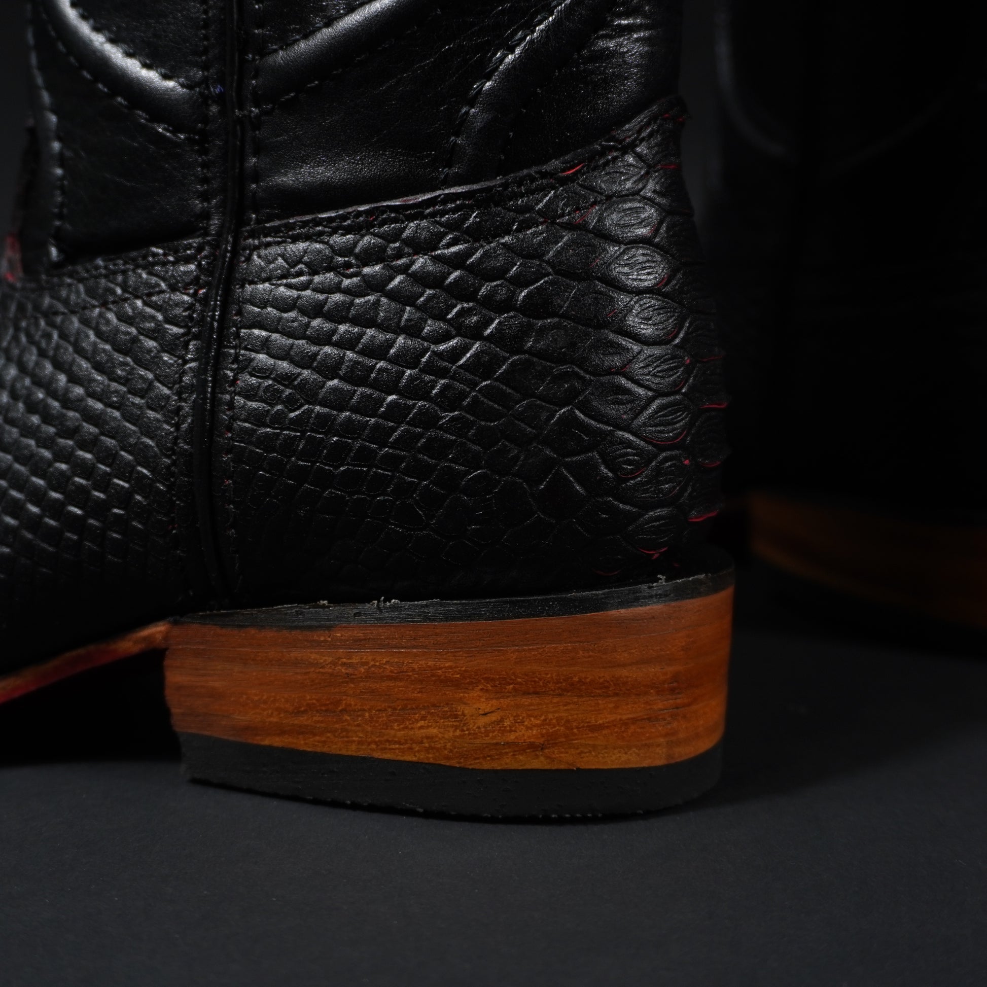 Botas negras con rojo piton, suela roja y punta cuadrada